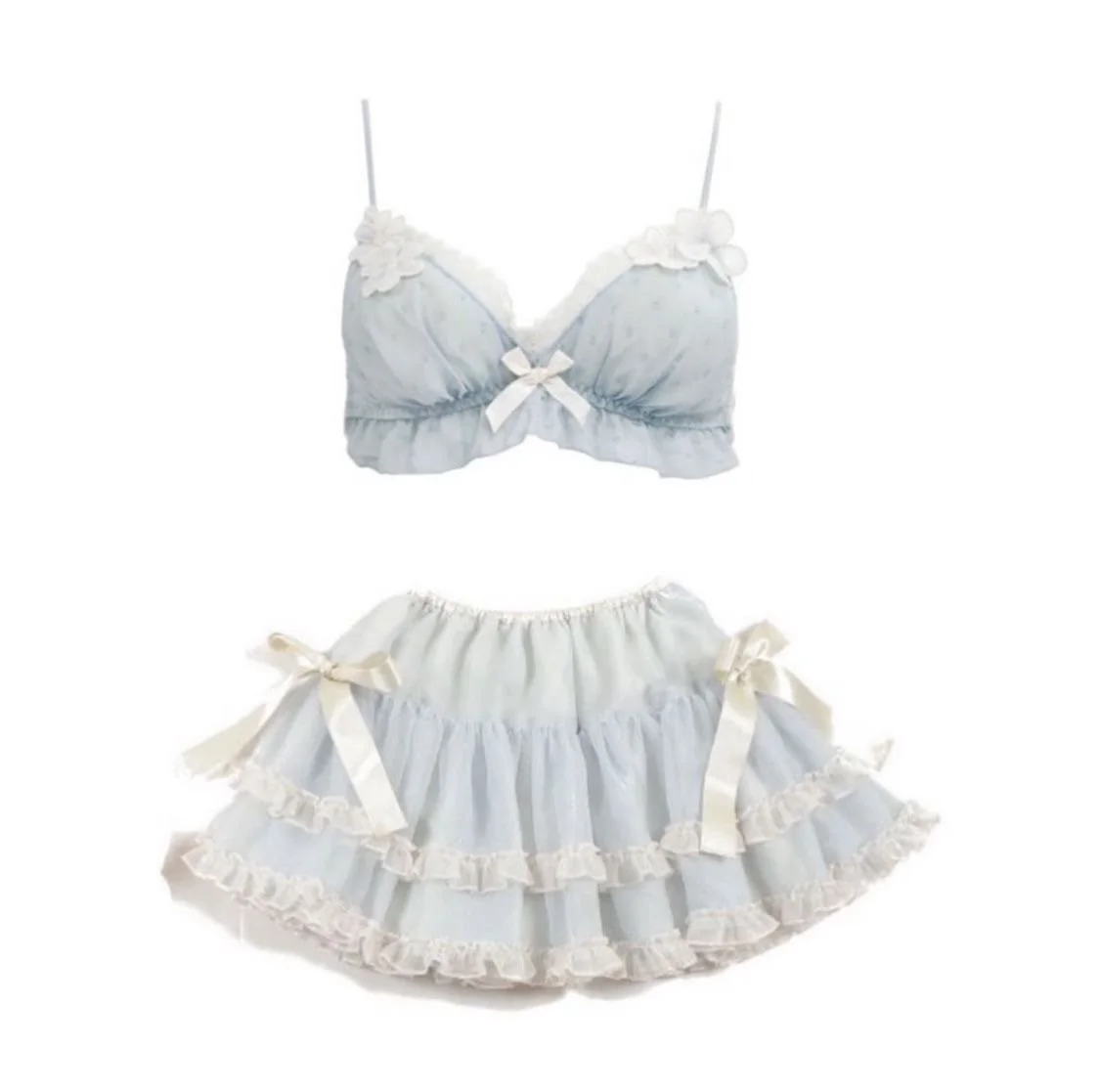 Baby blue lace, delicate bows, and a layered ruffled skirt. Gluttony is indulgent and effortlessly dreamy — made for moments of self-love.